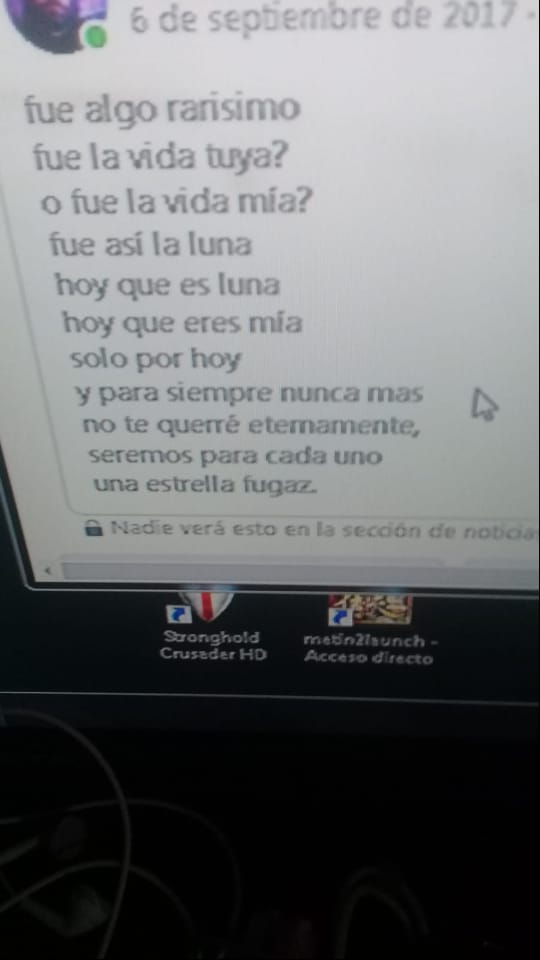 -En el espacio entre beso y beso de dos primeros amores, en ese instante que no pueden evitar separar sus bocas y tomar aire para seguir besándose, en ese pequeño espacio quiero estar, formar parte con lo que se pueda, como con el oxigeno que le deberia quedar a mis pulmones recientemente muertos o aportar con mis moléculas de agua también podría ser.
